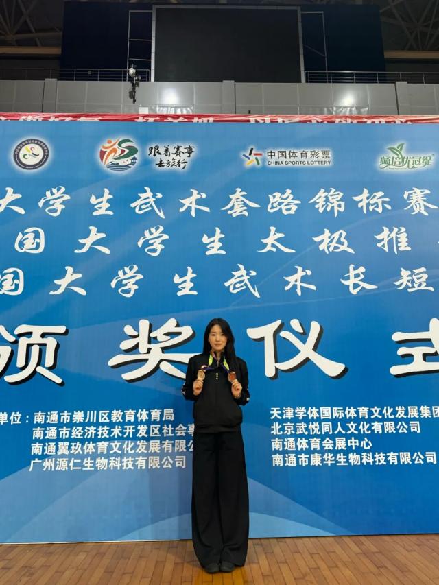 10月27日至31日,2025年中国大学生武术套路锦标赛在江苏南通盛大举行。本次比赛吸引了来自全国278所高校的3000余名教练员和运动员参赛,清华大学、北京体育大学、复旦大学等知名院校均派队参赛。研究生教育学院巩瑶凭借扎实的专业功底与稳定的竞技状态,荣获女子丙A组32式太极剑第二名(银牌)和秋分八卦功法第三名(铜牌)。